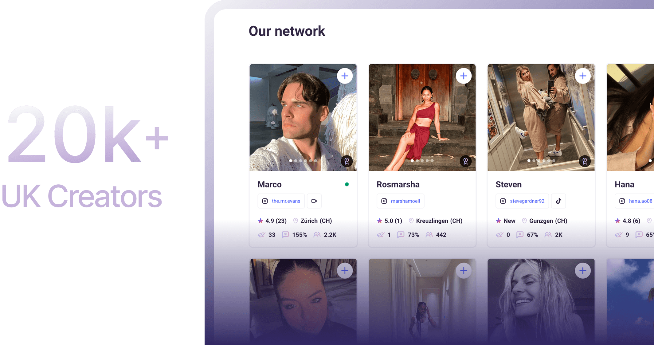 Mit über 20.000 Creatorn in UK & DACH briefen Sie in Minuten und aktivieren in Tagen – und überfluten die Feeds Ihrer Zielkunden mit der Vielfalt und dem Volumen, das Werbeplattformen schätzen.